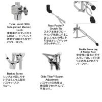 バスケットの角度は無段階で設定が可能で、安定性にも優れたスネアスタンドです。新たに採用された“RESO POCKET CRUTCH TIP”は、スネア本体をフローティング状態にセッティングすることでナチュラルな鳴りを引き出してくれます。