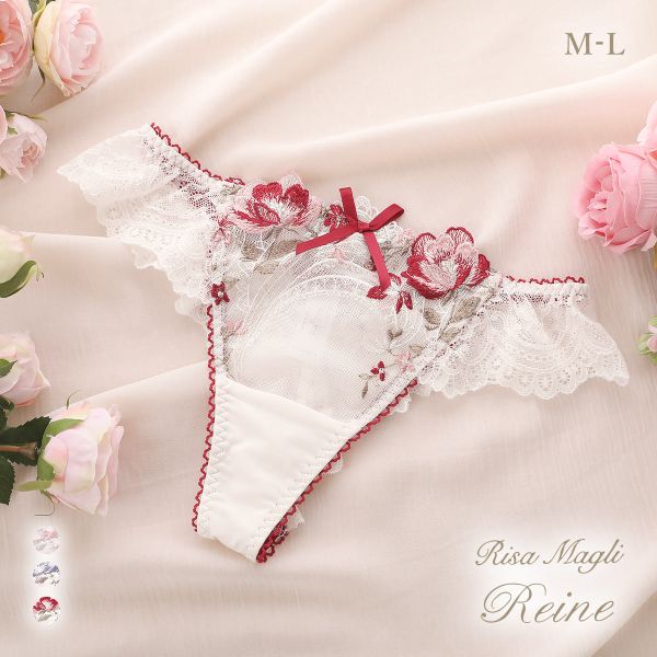 バラのお花と扇形模様を組み合わせた、リサマリレーヌ「サリー」コレクション。レース全体に咲きほこる大輪のバラは、大胆なカラーリングでインパクトを持たせつつも、女性らしい印象に。周りには様々な小花の刺繍や小さなアップリケをあしらい、可愛らしさをプラスしました。
