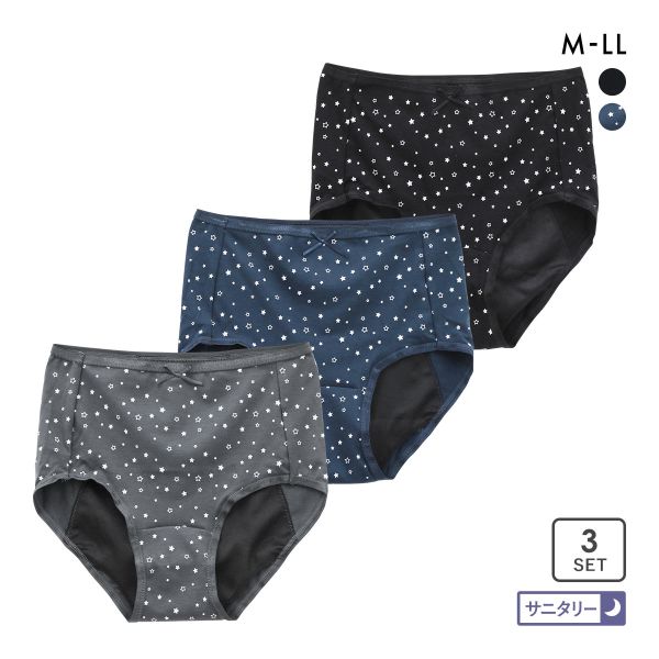 ベーシックな3色で使いやすい夜用サニタリーショーツ3枚組です。