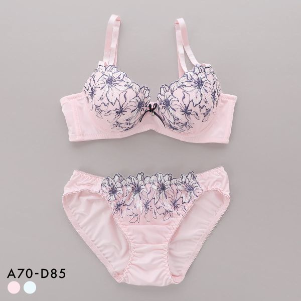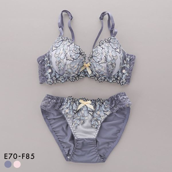 きらめくラメと光沢が美しいローズ刺繍がカップを埋めつくす、繊細で華やかなスリップ&ショーツセット。胸中心には刺繍糸と色を合わせた大きなリボンをあしらい愛らしさをプラス。