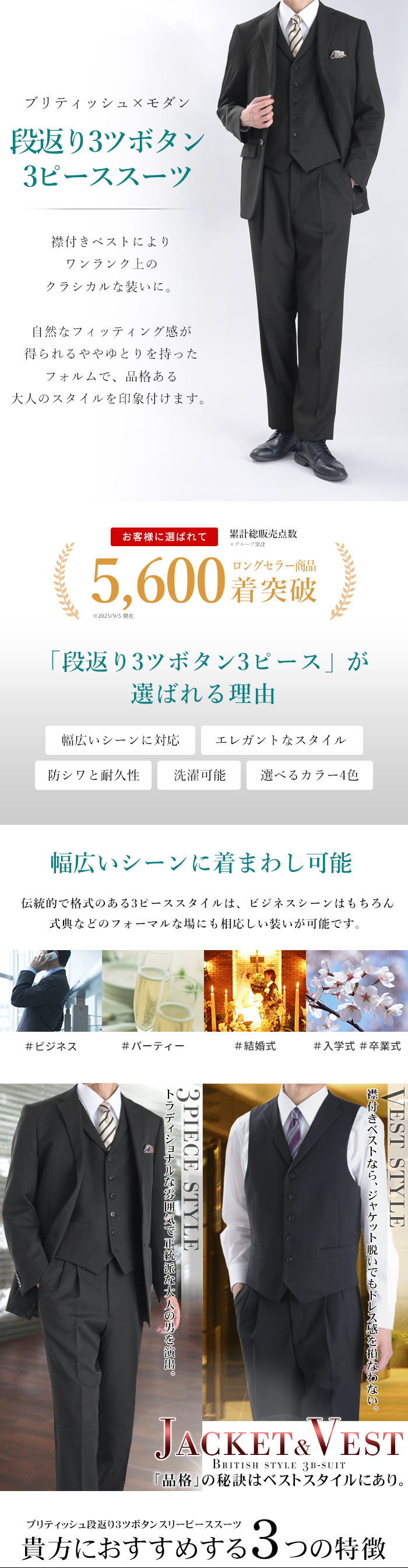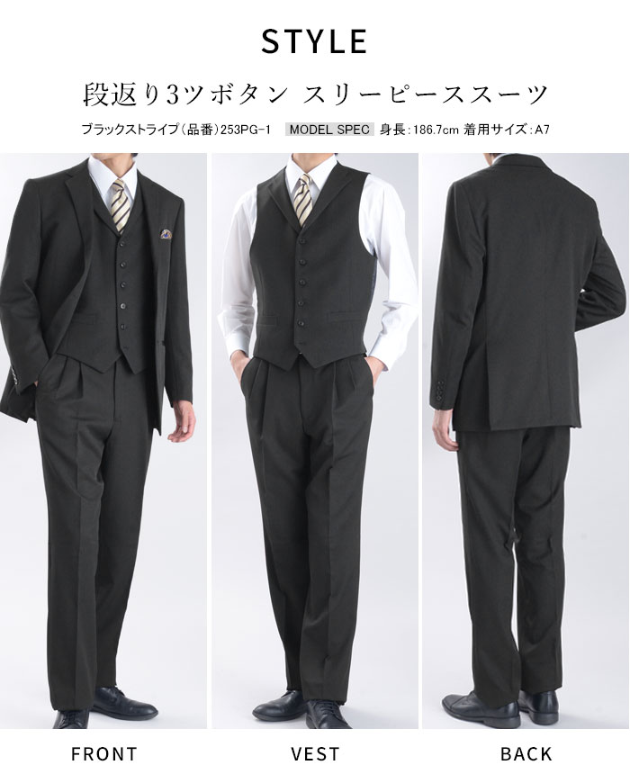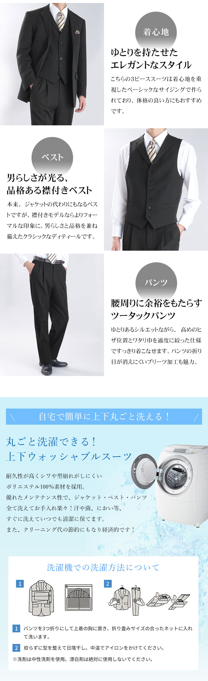 | <ジャケット> 段返り3ツボタン シングルスーツ サイドベンツ 背抜き仕立て お台場仕立て 胸ポケット フラップポケット ウォッシャブル機能 <ベスト> 襟付き 6ツボタン シングル ウォッシャブル機能 ウエスト調節可能な尾錠付き <パンツ> ツータックパンツ プリーツ加工 洗えるスラックス ウォッシャブル機能 |