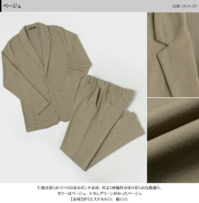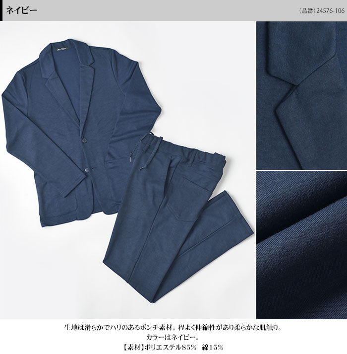 | ◆ジャケット ノッチドラペル 2ツボタン シングル パッチポケット ウォッシャブル仕様 ストレッチ素材 ◆パンツ ノータックパンツ ストレッチ素材 ベルトループあり ウエストゴム仕様 ウエスト調整紐付き ミシン仕上げで裾上げ済み ウォッシャブル仕様 |