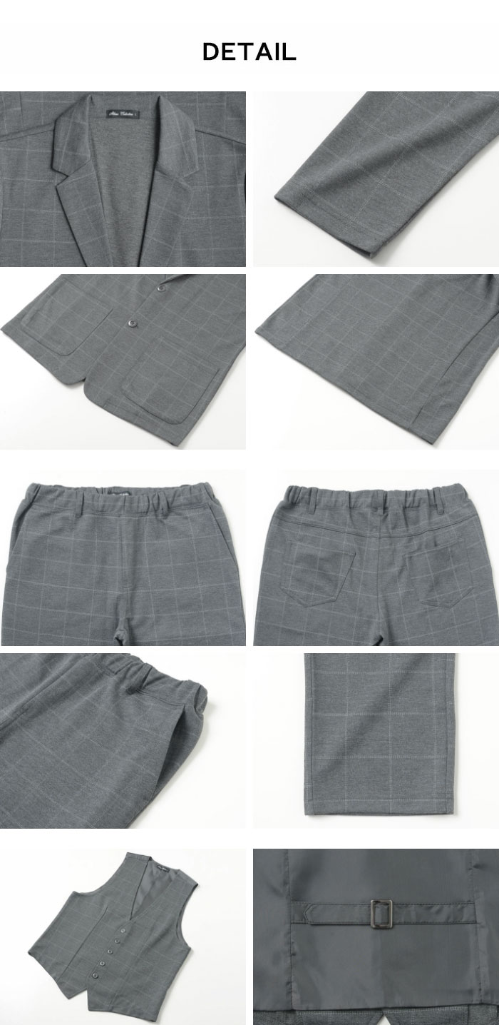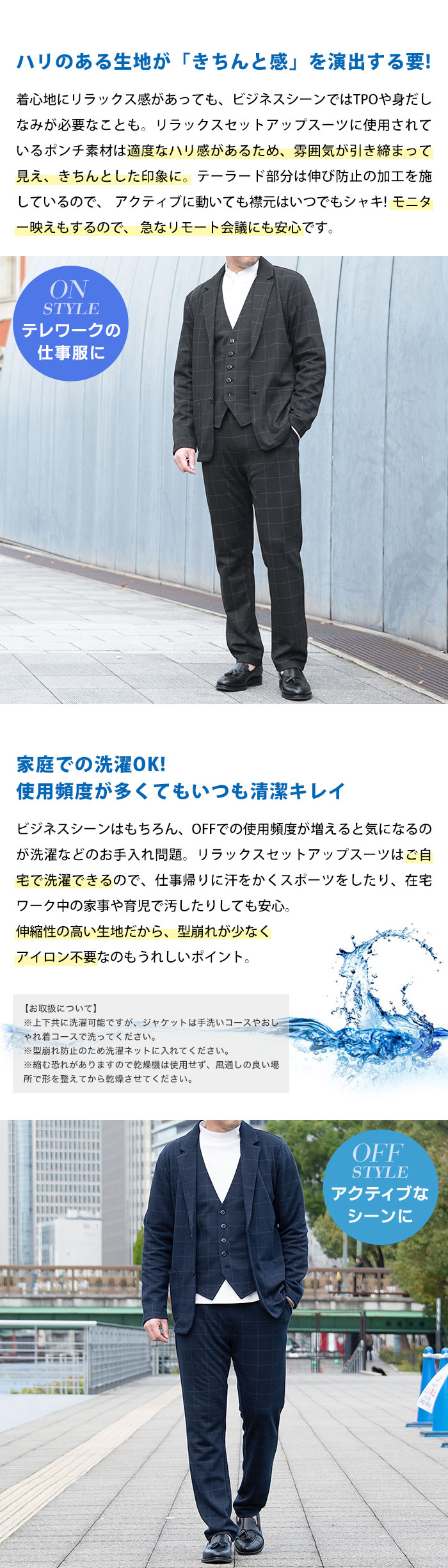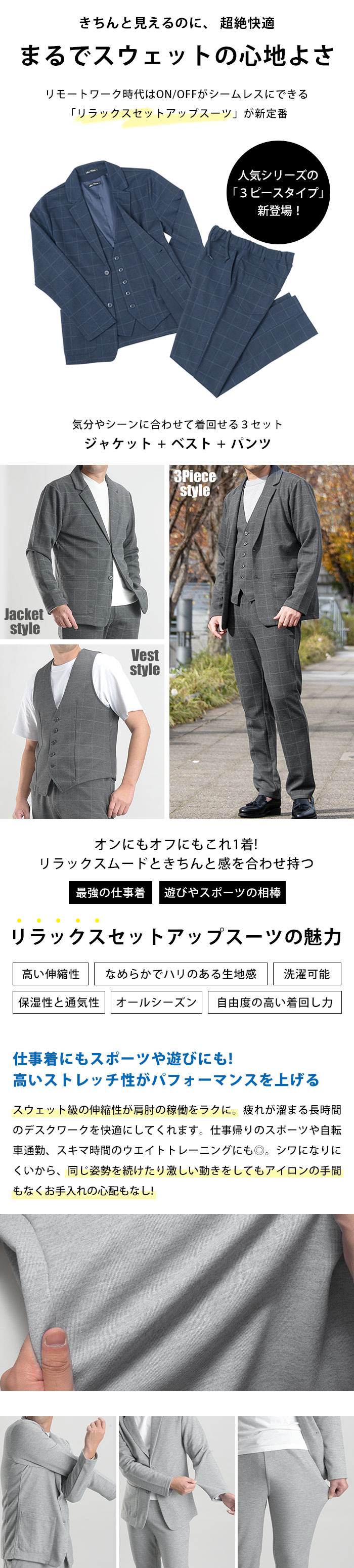 メンズ(男性用・紳士服) メンズファッション ジャケット パンツ セットアップ 軽量 軽い イージーパンツ ドローストリング リラックスパンツ アクティブフィットスーツ ビジカジ 灰色 黒 紺 部屋着 家着 ルームウェア ホームウェア ワークスーツ web会議 リモートワーク 在宅勤務 ウィンドウペンチェック 格子柄 3ピーススーツ スリーピース 2つボタン メンズスーツ ジレ ベスト 三つ揃い おしゃれ