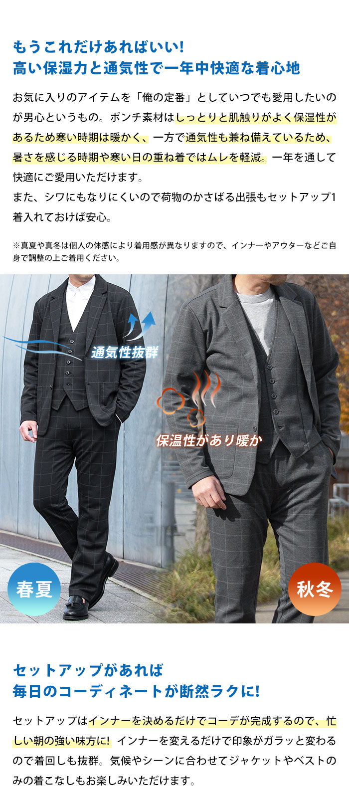 セットアップ 裾上げ済 メンズ 3ピース スーツ カジュアルスーツ スリーピーススーツ チェック ポンチ素材 スウェット ストレッチ