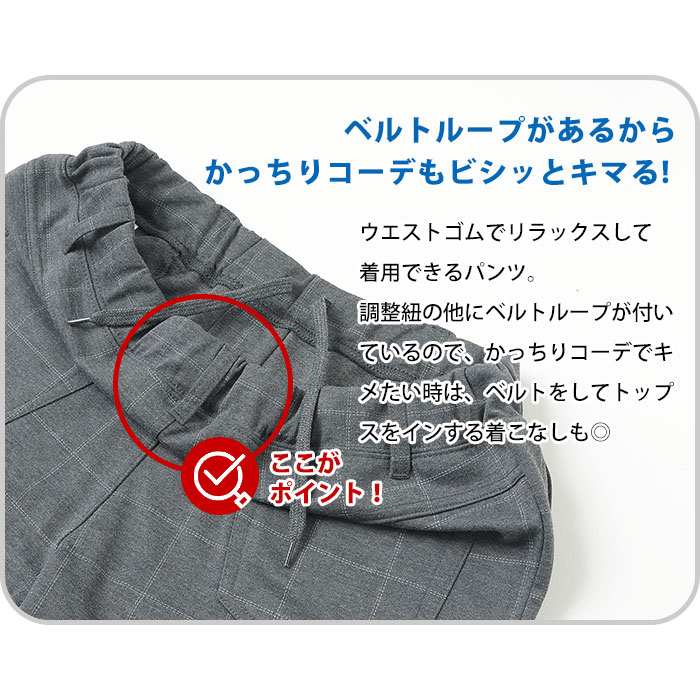 ノータックパンツ ストレッチ素材 ベルトループあり ウエストゴム仕様 ウエスト調整紐付き ミシン仕上げで裾上げ済み ウォッシャブル仕様