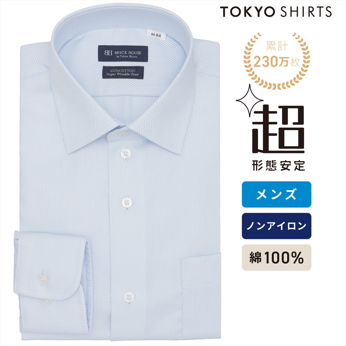 | 仕様 | カフリンクス使用可能な兼用カフス (アジャストボタン) 中丸カフス 胸ポケット(左胸)付き(ホームベース型) 背タック・背ダーツなし 衿キーパー:差込式(予備なし) 前立:裏前立仕様 |