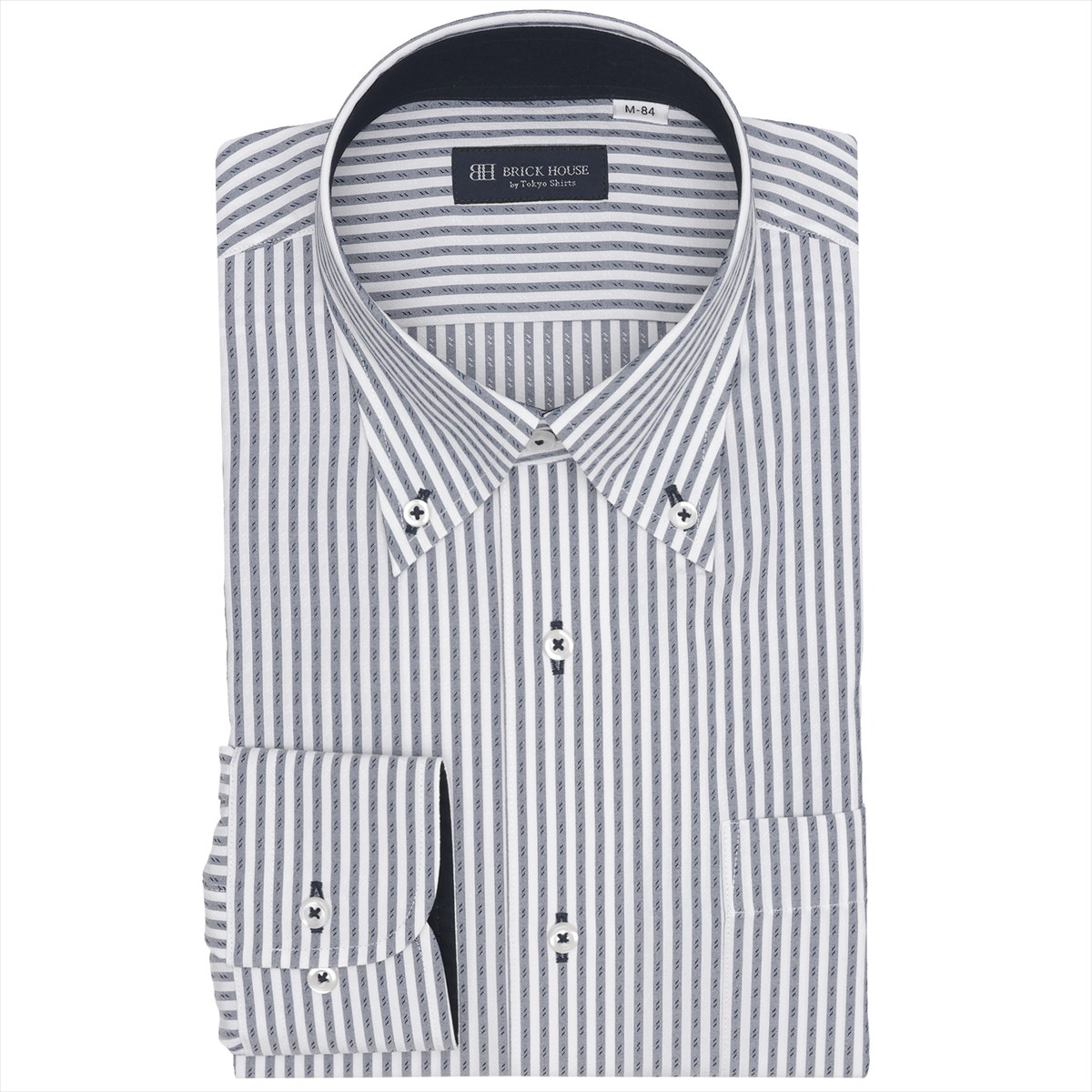 | 仕様 | カフリンクス使用可能な兼用カフス (アジャストボタン) 中丸カフス 胸ポケット(左胸)付き(ホームベース型) 背タックなし・背ダーツあり 前立:裏前立仕様 台衿内側・カフス裏側:別布仕様 |
