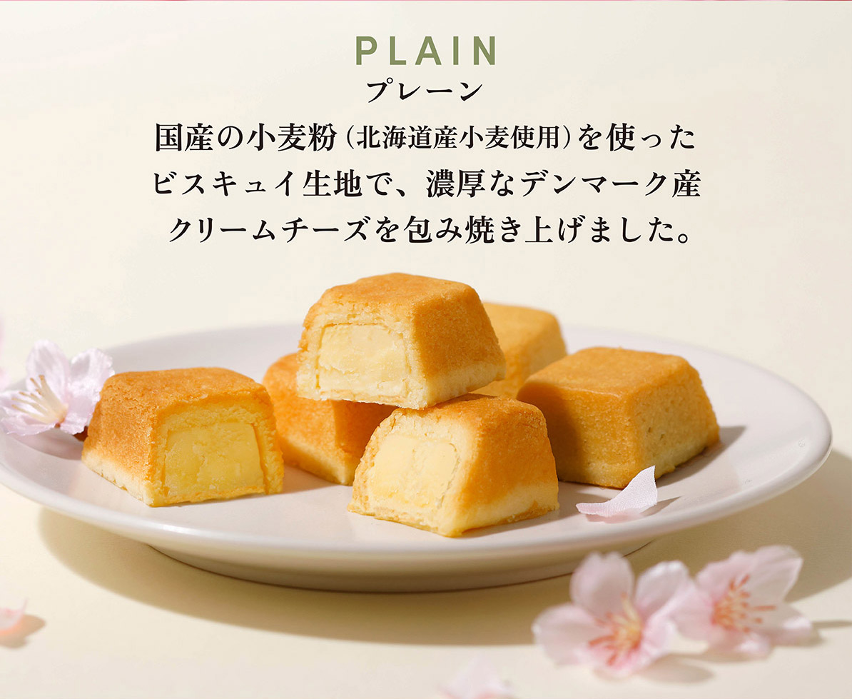 国産の小麦粉(北海道産小麦使用)を使った桜の香りのビスキュイ生地で、桜の花由来のペーストを加えた濃厚なデンマーク産クリームチーズを包み焼き上げました。