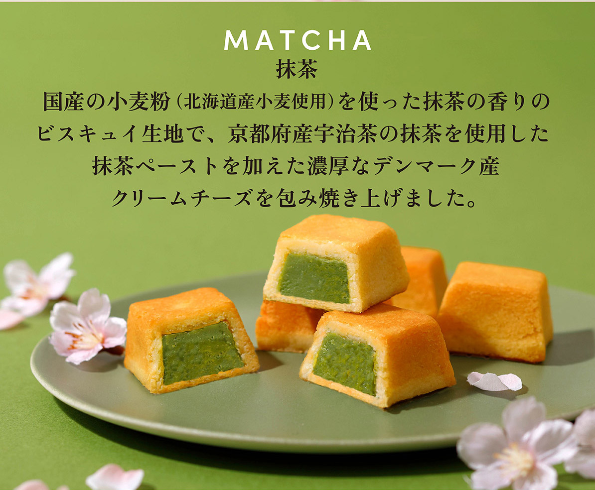 国産の小麦粉(北海道産小麦使用)を使った抹茶の香りのビスキュイ生地で、京都府産宇治茶の抹茶を使用した抹茶ペーストを加えた濃厚なデンマーク産クリームチーズを包み焼き上げました。