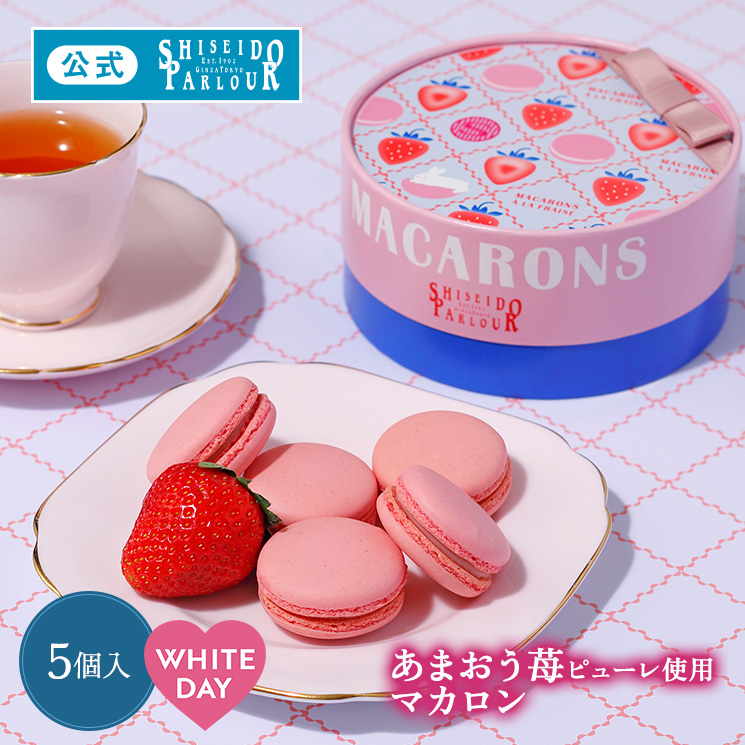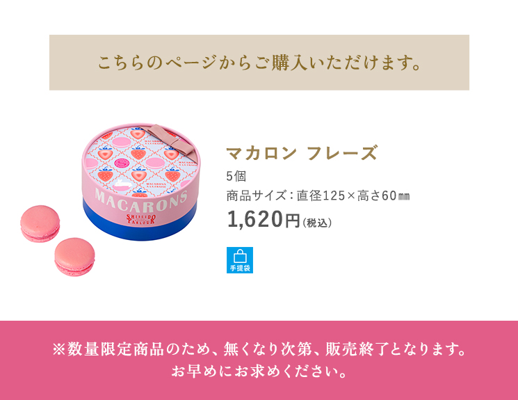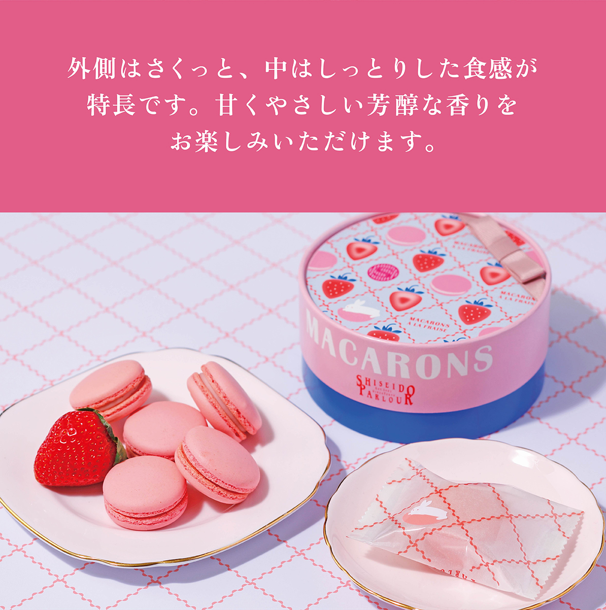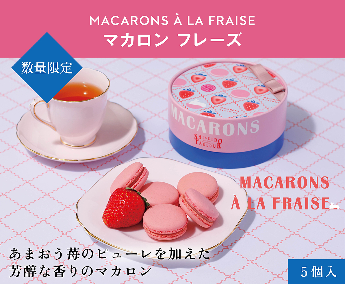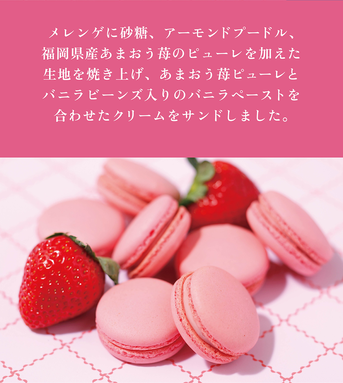 メレンゲに砂糖、アーモンドプードル、福岡県産あまおう苺のピューレを加えた生地を焼き上げ、