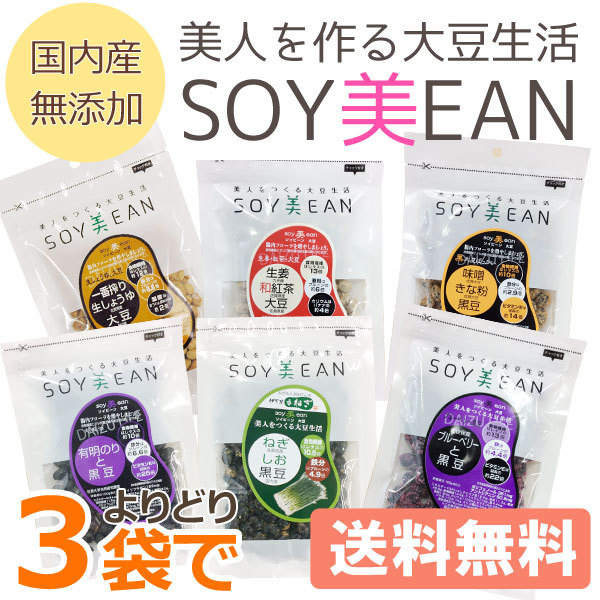 「ねぎ・しお・黒豆」「味噌・きな粉・黒豆(黒大豆ばっかい)」「ブルーベリーと黒豆」「有明のりと黒豆」「生姜・和紅茶・大豆」「一番搾り生しょうゆ大豆」の中からよりどり3種セットです。