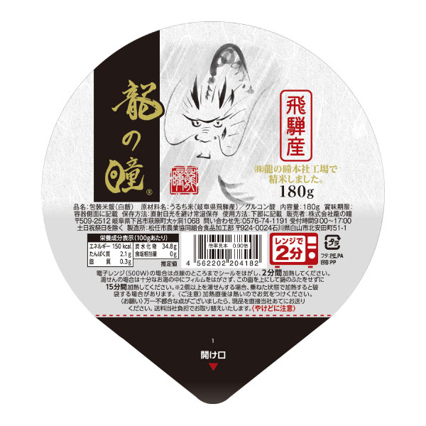 | 商品番号 | et0707 | | 原材料 | うるち米(龍の瞳 岐阜県飛騨産)/グルコン酸 | | 内容量 | 180g | | 栄養成分表示 | エネルギー:150kcal、たんぱく質:2.1g、脂質:0.3g、炭水化物:34.8g、食塩相当量:0g | | 殺菌方法 | 気密性容器に密封し、加圧加熱殺菌 | | 保存方法 | 高温多湿、直射日光を避け常温保存 | | 賞味期限 | 製造日より1年 | | 販売元 | 株式会社龍の瞳 | | 広告文責 | 有限会社自然館 0957-22-8770 |