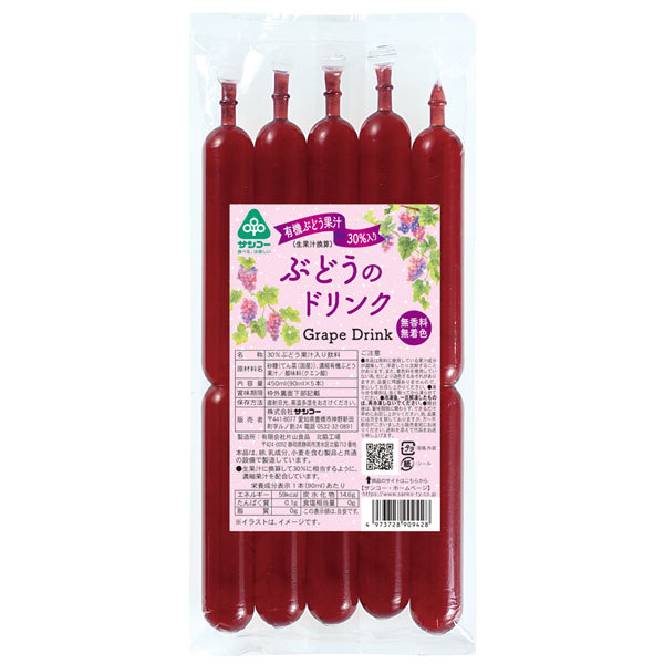 | 商品番号 | ms33423 | | 原材料 | 砂糖(てん菜(国産))、濃縮有機ぶどう果汁/酸味料(クエン酸) | | 内容量 | 90ml×5 | | 栄養成分表示 | (1本(90ml)あたり)エネルギー:59kcal、タンパク質:0.1g、脂質:0g、炭水化物:14.6g、食塩相当量:0g | | 保存方法 | 直射日光・高温多湿をお避けください。 | | 賞味期限 | 製造日より6ヵ月 | | 販売元 | 株式会社サンコー | | 広告文責 | 有限会社自然館0957-22-8770 |