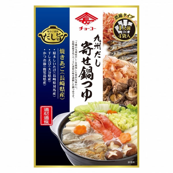 長崎県産焼きあご、対馬産原木しいたけ、鹿児島県産かつお節、大分県産干しえび、4つの九州産だし原料を使用した鍋の定番寄せ鍋つゆです。
