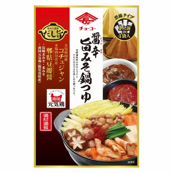 醤辛(じゃんから)旨みそ鍋つゆは辛くて美味しい!発酵調味料の旨みとコクと、ピリッとクセになる辛さ、天日干し唐辛子を使用した本場韓国コチュジャンと伝統的な発酵製法による本場卑県豆板醤(正しくは卑におおざとへん)(ピーシェントウバンジャン)にチョーコー自慢の麦みそ・米みそとチキン・ポークの風味を合わせました。