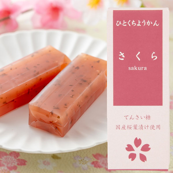 国産塩漬け桜葉を練りこみ、北海道産の白いんげん豆とてんさい糖で作った、食べきりサイズのミニ羊羹です。京の餡メーカーと作り上げた逸品で、桜のほのかな香りが引き立ちます。