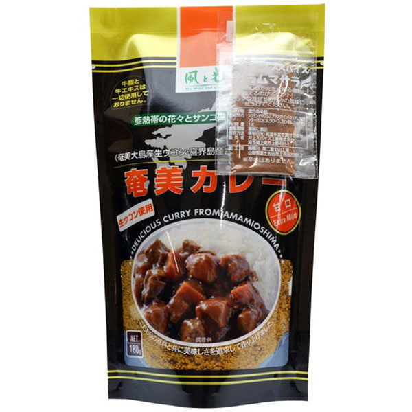 奄美大島産生ウコン・北海道産小麦粉・喜界島産砂糖などの厳選素材を使用した甘口カレールーカレーの風味をアップするオリジナルスパイス付きです。
