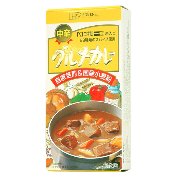 29種類ものスパイスを贅沢にブレンドし、圧搾しぼりのべに花油や自家焙煎の国産小麦粉、チキンブイヨン、濃縮りんご果汁など、素材にこだわって仕上げた香り豊かな中辛カレールウです。