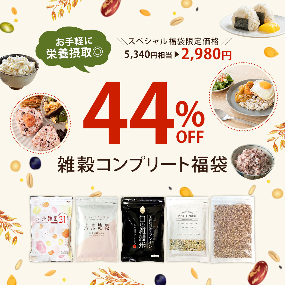 【44%オフ】 福袋 まとめ買い 期間限定 雑穀コンプリート福袋 国産 未来雑穀マンナン入り 未来雑穀マンナン無添加 白の雑穀 プロテイン雑穀 国産もち麦 送料無料