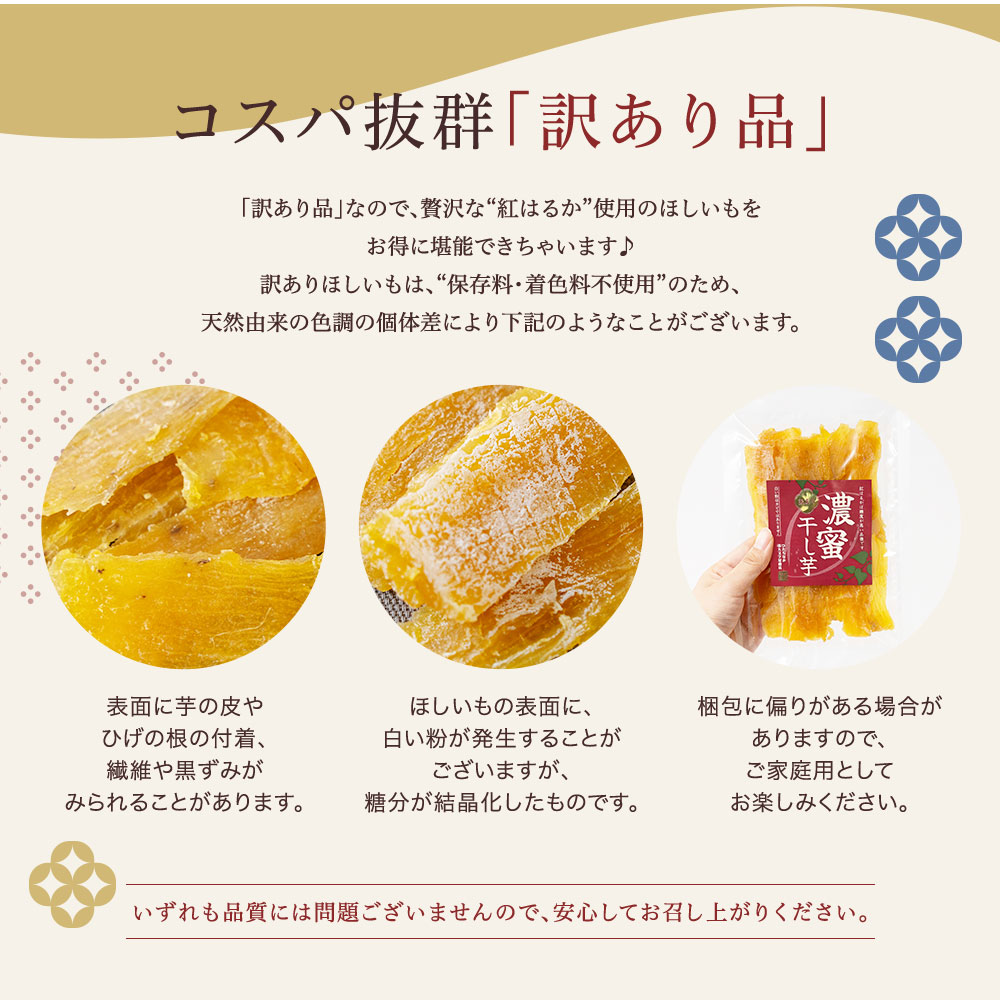 ・ほしいもが重なった状態など、見た目・梱包に偏りがある場合がございます。ご家庭用としてお楽しみください。