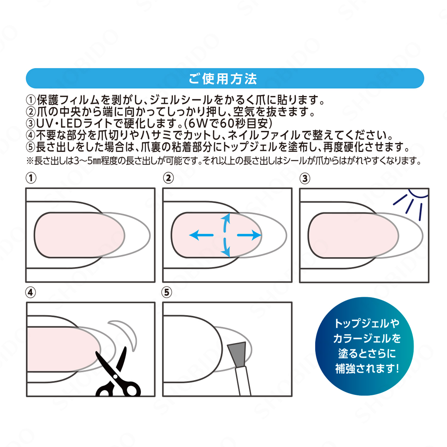 ※長さ出しは3~5mm程度の長さ出しが可能です。 それ以上の長さ出しはシールが爪からはがれやすくなります。