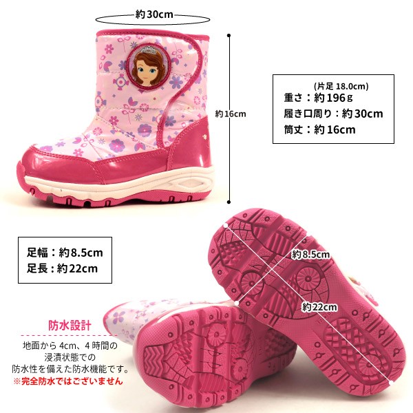 | 特徴 | ディズニーの「塔の上のラプンツェル」、「ちいさなプリンセス ソフィア」のキッズ用ウインターブーツです。 「ラプンツェル」、「ソフィア」をデザインしたサイドの飾りがポイントです。 雨雪時にもおすすめな「防水設計(4cm 4時間)」機能を搭載し、靴底はグリップ性を考慮した底意匠設計を採用しています。 さらに、中敷きと履口にボアを使用した「フットブランケット」機能を搭載しているので足下が暖かく、冬の通園や通学、おでかけにも活躍する商品です。 | |||||||