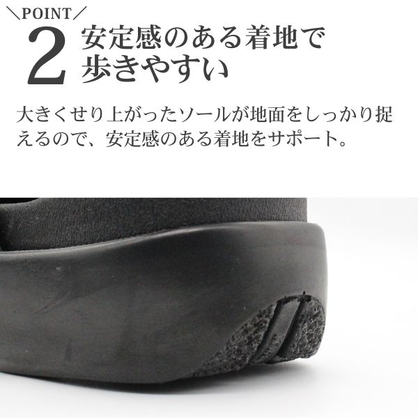 大きくせり上がったソールが地面をしっかり捉えるので、安定感のある着地をサポート。