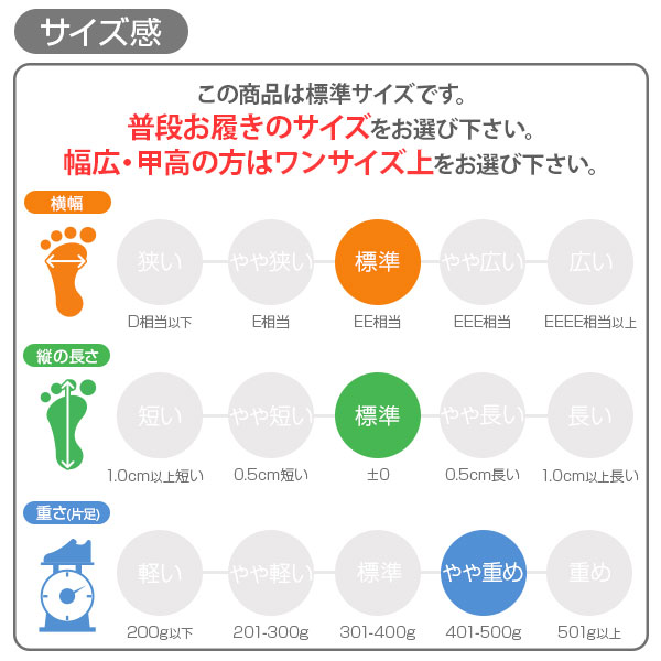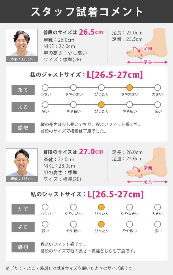 | こちらの商品は【標準サイズ】です。普段お履きのサイズをお選び下さい。 幅広・甲高の方はワンサイズ上をお選び下さい。 【男性スタッフ堺(169cm) 普段のサイズは、革靴26.0cm/日本製スニーカー26.5cmです】 私のジャストサイズはL[26.5-27.0cm]でした。靴下を履いて、程よいフィット感のあるサイズです。 |