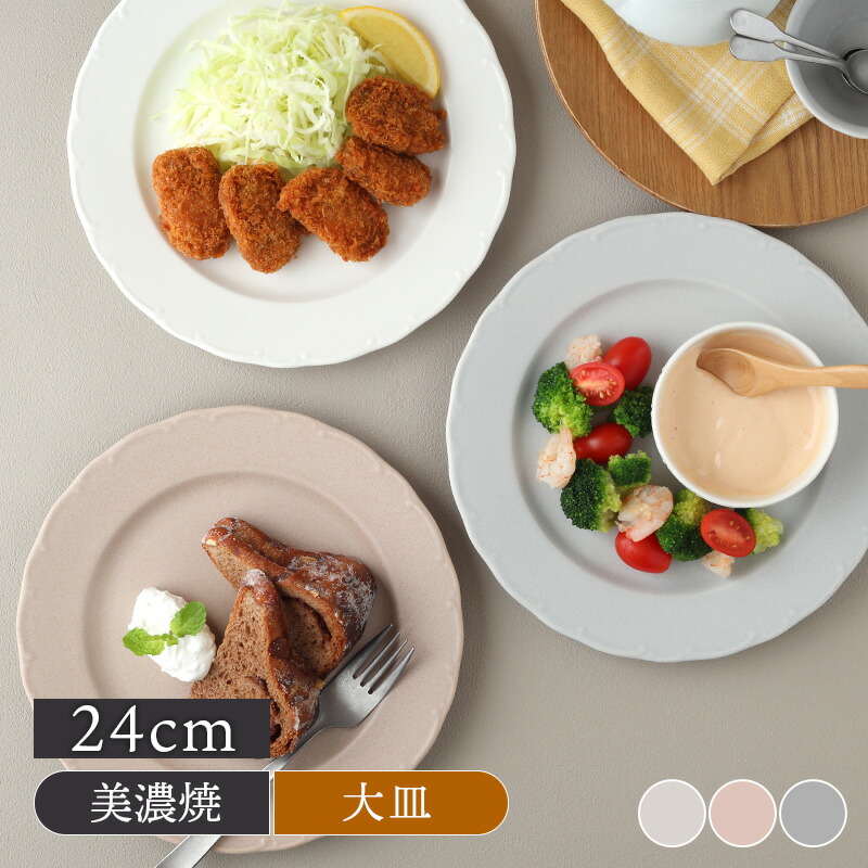 約24cmの大皿はディナープレートとして、メインディッシュに、その他パスタ皿やおかずの盛り皿、ワンプレートやランチプレートに、朝昼晩使える食器です。