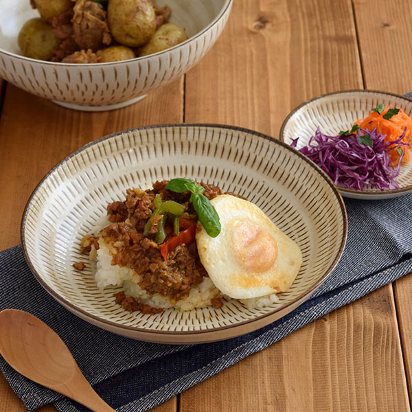 ![]() カレーやパスタに最適なサイズのボウル。写真はガパオライスを盛り付け。東南アジア料理も違和感なく包み込む懐の深さを感じさせます。サラダボウルとしてや煮物や炒め物の盛り皿としても使いやすいサイズです。 カレー皿 |
