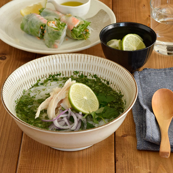 ![]() こちらは麺鉢。ラーメンやうどんなど麺類の器としてちょうどいいサイズですが、写真のように家族分の煮物の盛り付けなど盛り鉢として使っていただいても素敵です。口径が広く高さが浅めの形状は、お料理を盛り付ける際、山形に盛り付けるときれいに見えます。 麺鉢 |