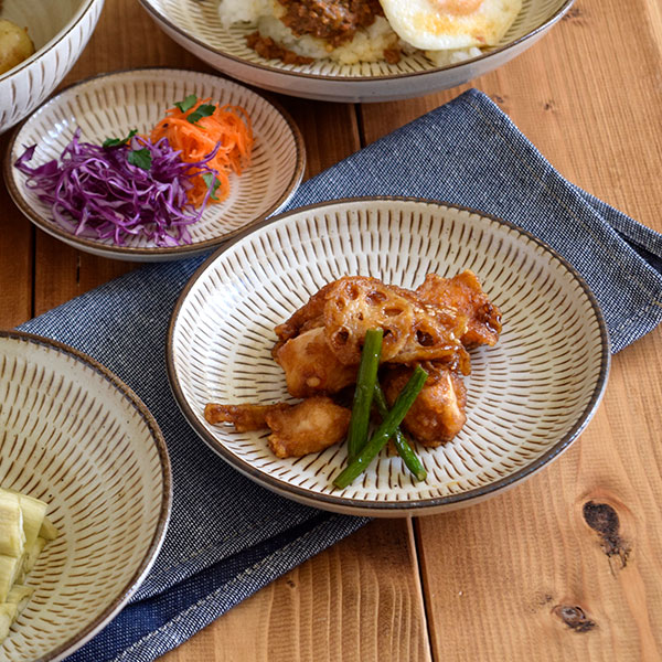 ![]() 約16.5cmの中皿サイズ。副菜の盛り付け、取り皿、ケーキ皿、サラダ皿など何かと出番の多いサイズなので、まずはこちらから揃えてみても。縁に立ち上がりがあるので、多少汁気のあるお料理もOK。かんな目が食材を引き立ててくれています。 中皿 |