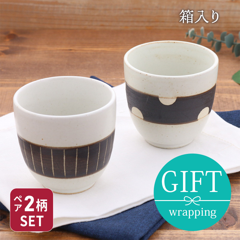 夫婦湯呑 箱入り 200cc 白マット 黒ベルト 手描き柄 ライン×ドット 送料無料湯呑み 湯飲み ゆのみ 湯のみ コップ カップ 茶器 食器 ドリンクウェア ギフ