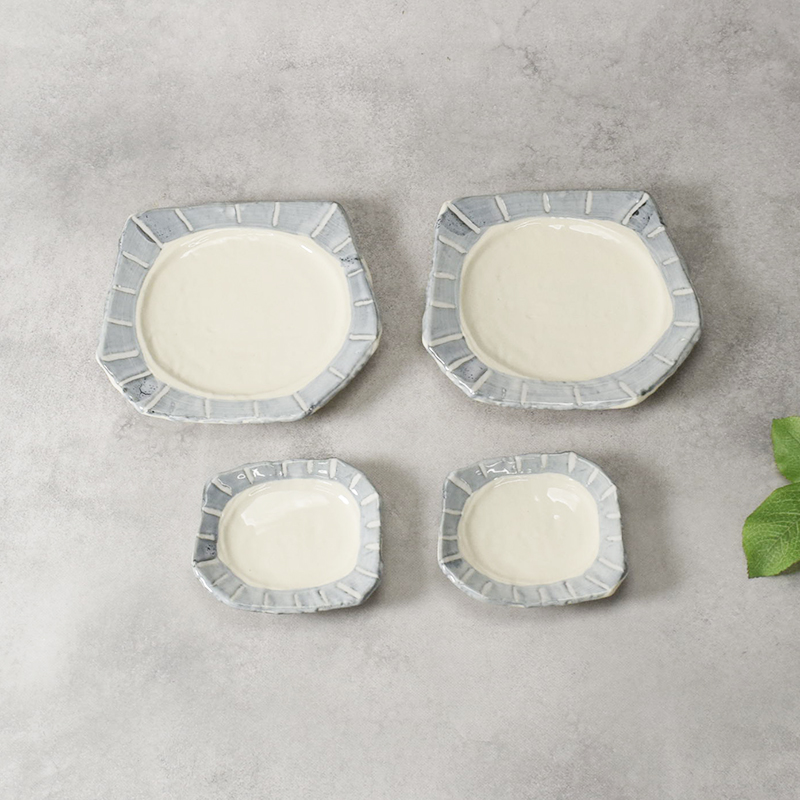 変形デザインと十草模様が目を引く、取り皿&小皿の4点セット。