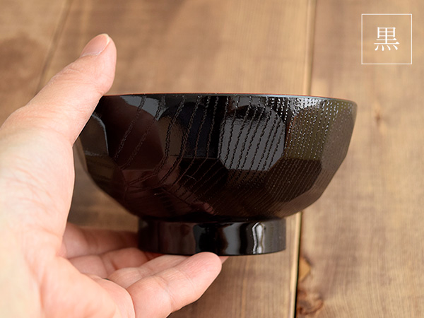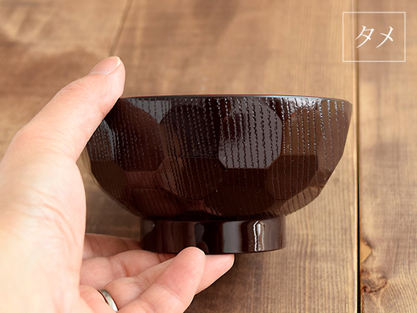 ![]() 表面の色合いが2種類あり、シックな黒とモダンなブラウンカラーのタメ。 どちらも和食器と相性のいい和の色合い。 内側に塗られた朱色は日本ではおめでたいものに使われる色でもあるので、ちょっとしたお祝いの席にも似合いそう。 ご家族で同色をお揃いに揃えてもいいですし、色違いで揃えれば、ご夫婦でペアの汁碗としても使えるカラーです。 | ||