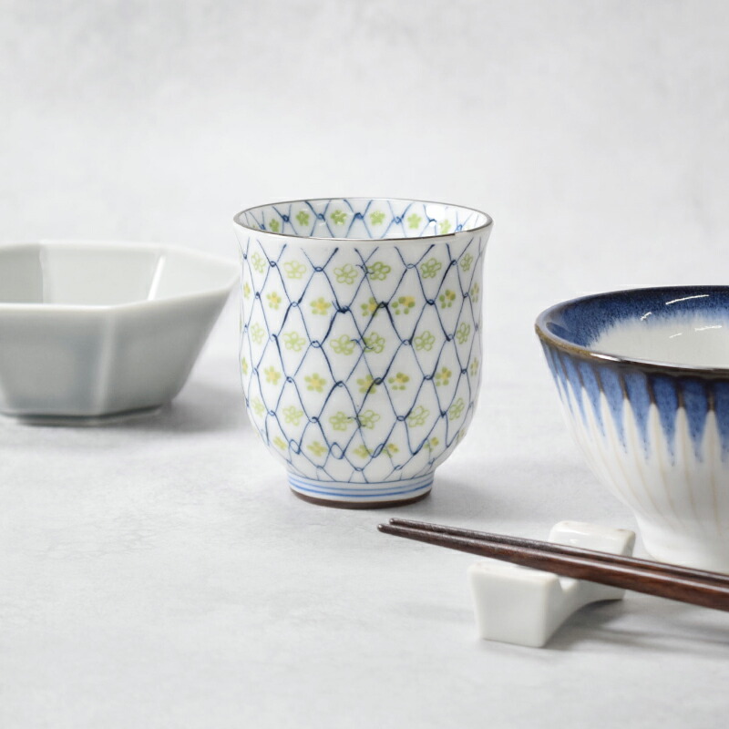 縁起の良い、和の伝統柄の網目模様に小花を重ねた、上品で可愛らしい、ゆのみ。
