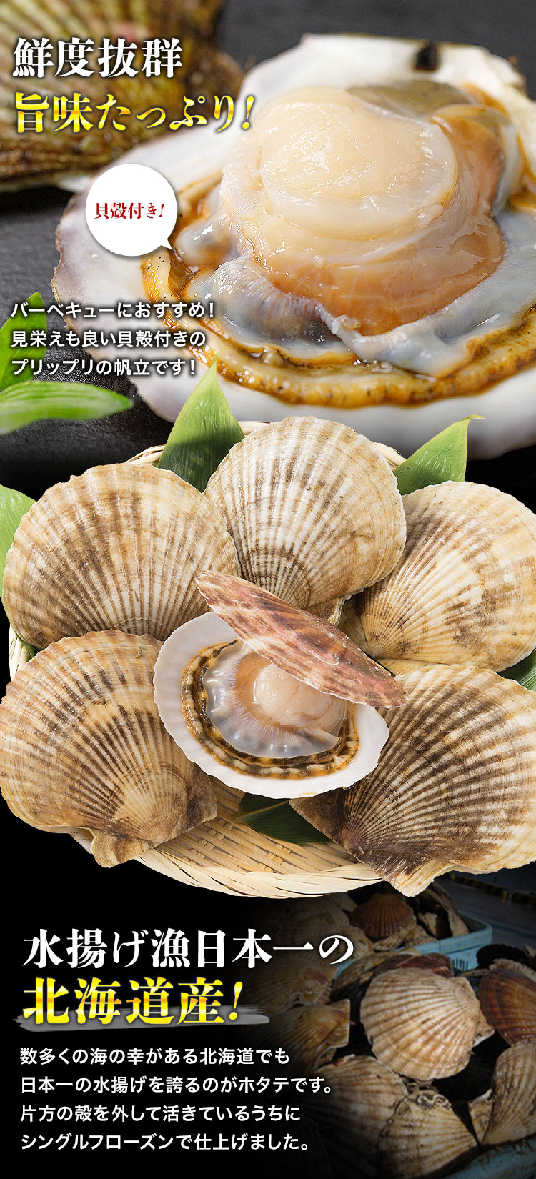 〇北海道で水揚げされ鮮度抜群のほたてを食べやすく片方の殻をはずして急速冷凍