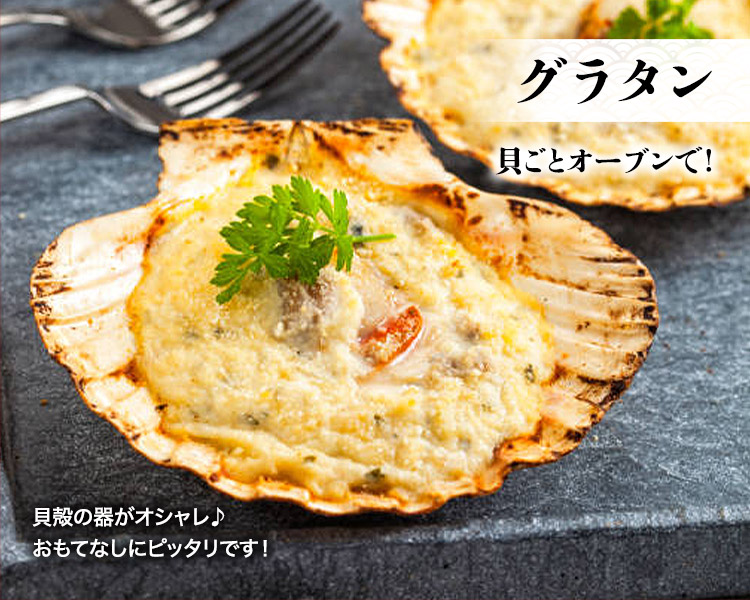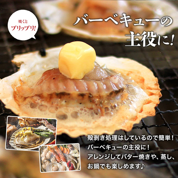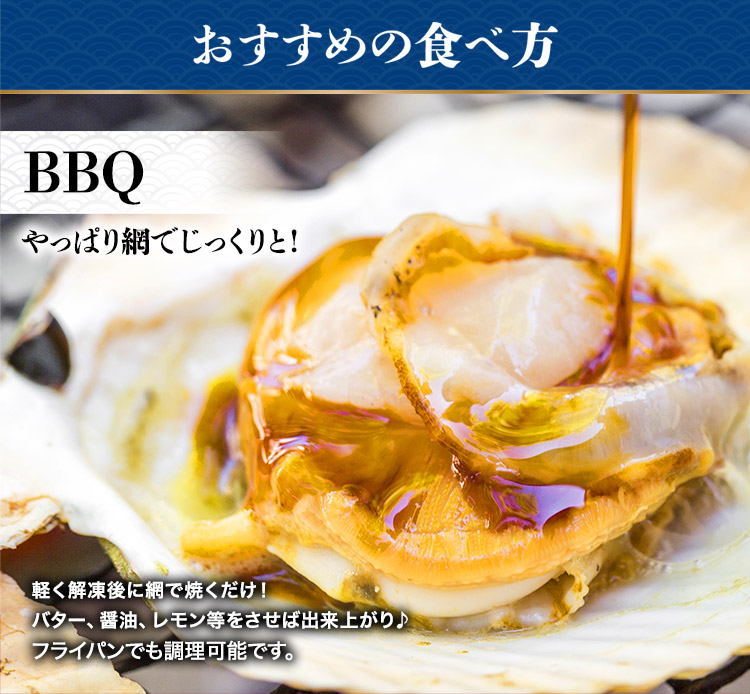 軽く解凍後網で焼くだけバター、醤油、レモン等をさせば出来上がり簡単に本格殻焼き帆立を召し上がれます。