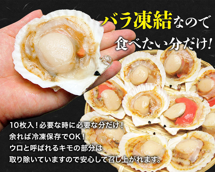 【商品名】 片貝付き帆立貝 【原材料名】 帆立貝 【内容量】 10枚 【発送タイプ】 冷凍 【保存方法】 要冷凍-18℃以下 【賞味期限】 商品記載(※ご家庭の冷凍庫では2ヶ月程度を目安にお早めにお召し上がりください。) 【産地】 北海道