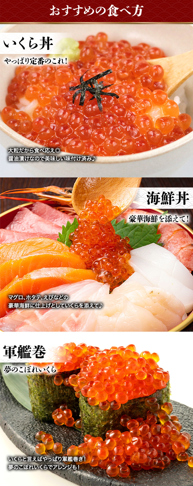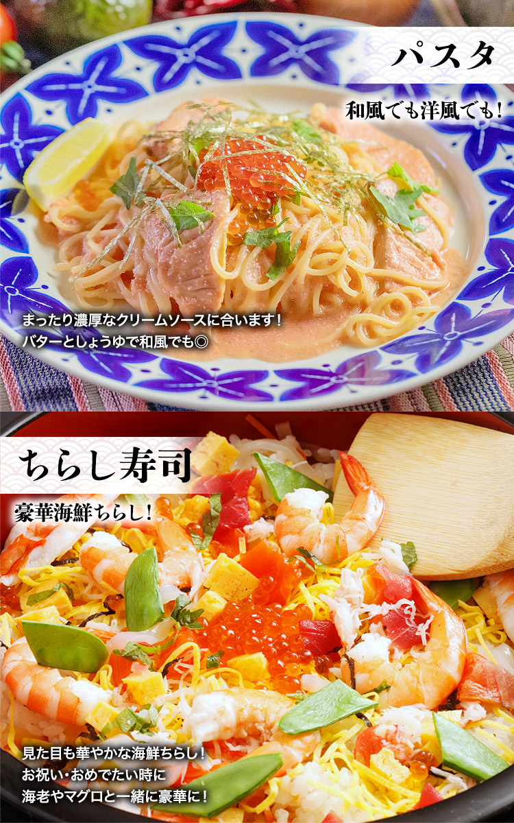 そのままはもちろん、贅沢ないくら丼、手巻き寿司、ちらし寿司など、