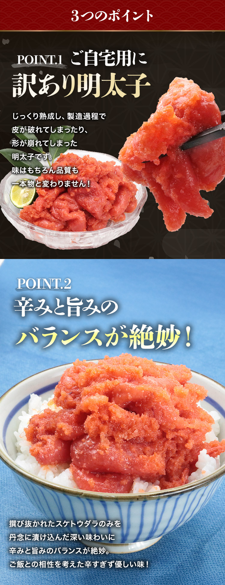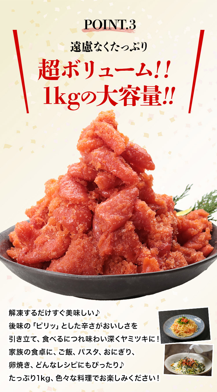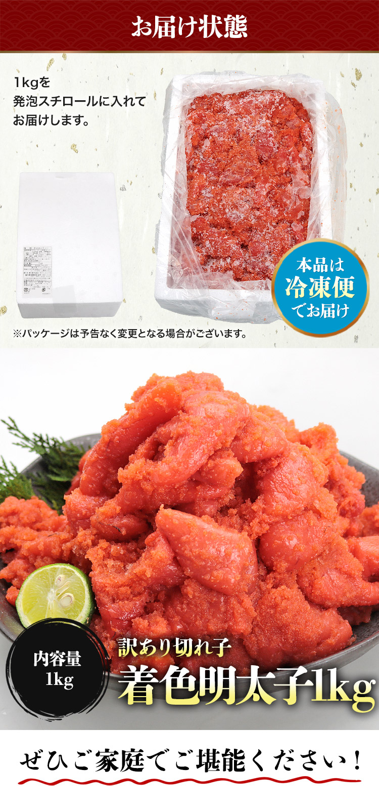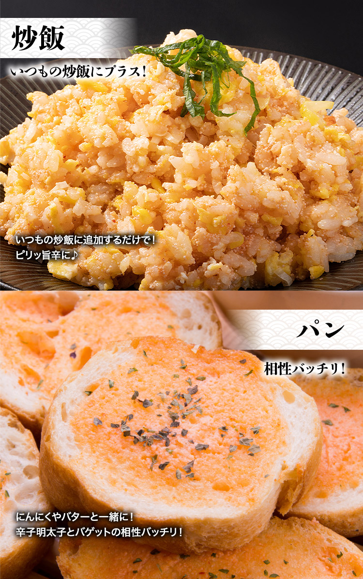 すけとうだらの卵巣(ロシア又は米国)、食塩、発酵調味料、果糖ブドウ糖液糖、魚介エキス、唐辛子、醤油(小麦・大豆を含む)/調味料(アミノ酸等)、酒精、甘味料(ソルビット)、酸化防止剤(V.C)、ナイアシン、pH調整剤、着色料(赤102、黄5、赤3)、酵素、発色剤(亜硝酸Na)