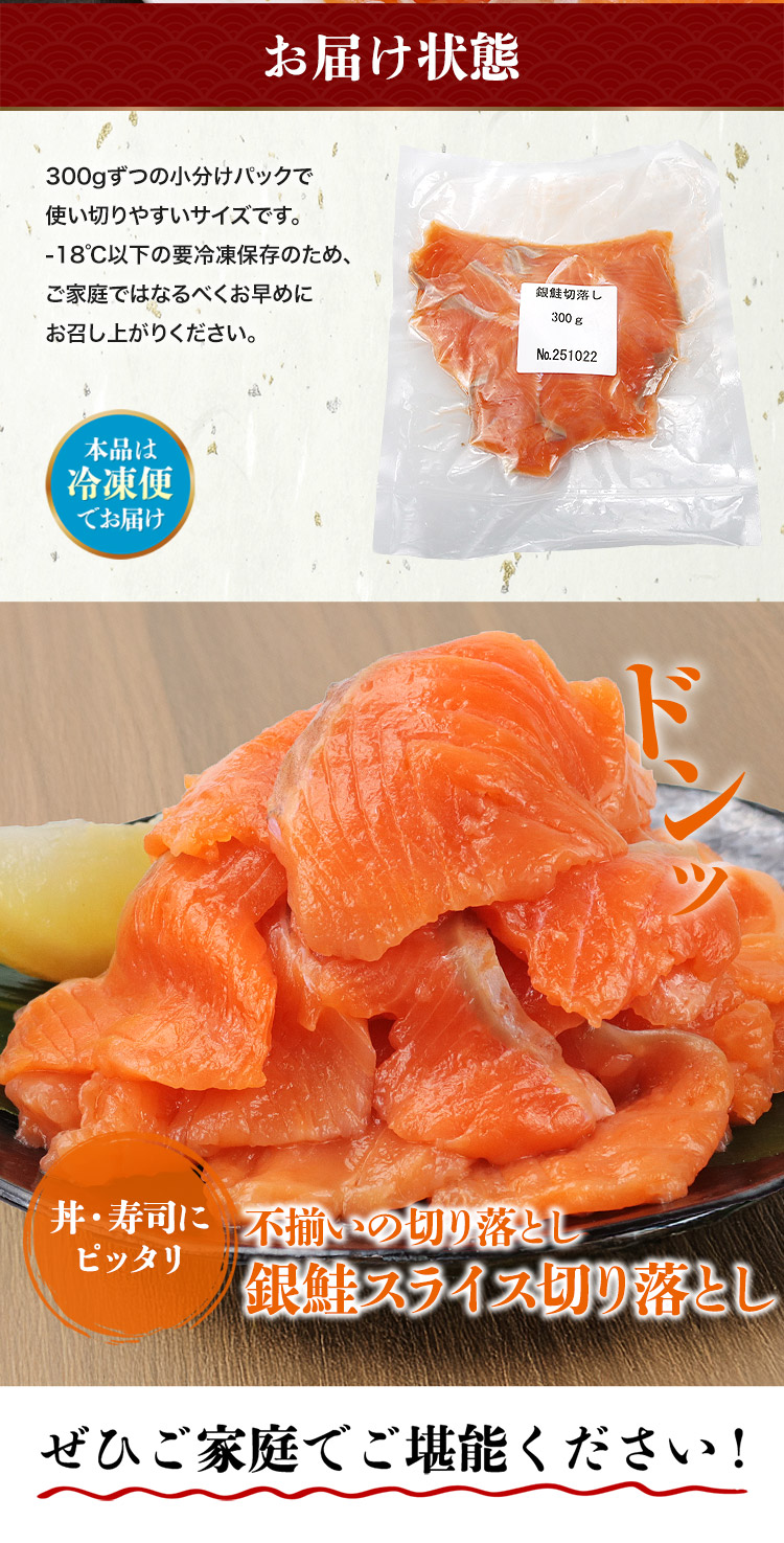 銀鮭 サーモン 切り落とし 300g 不揃い お刺身 生 生食可 鮭 スライス 丼 寿司 冷凍