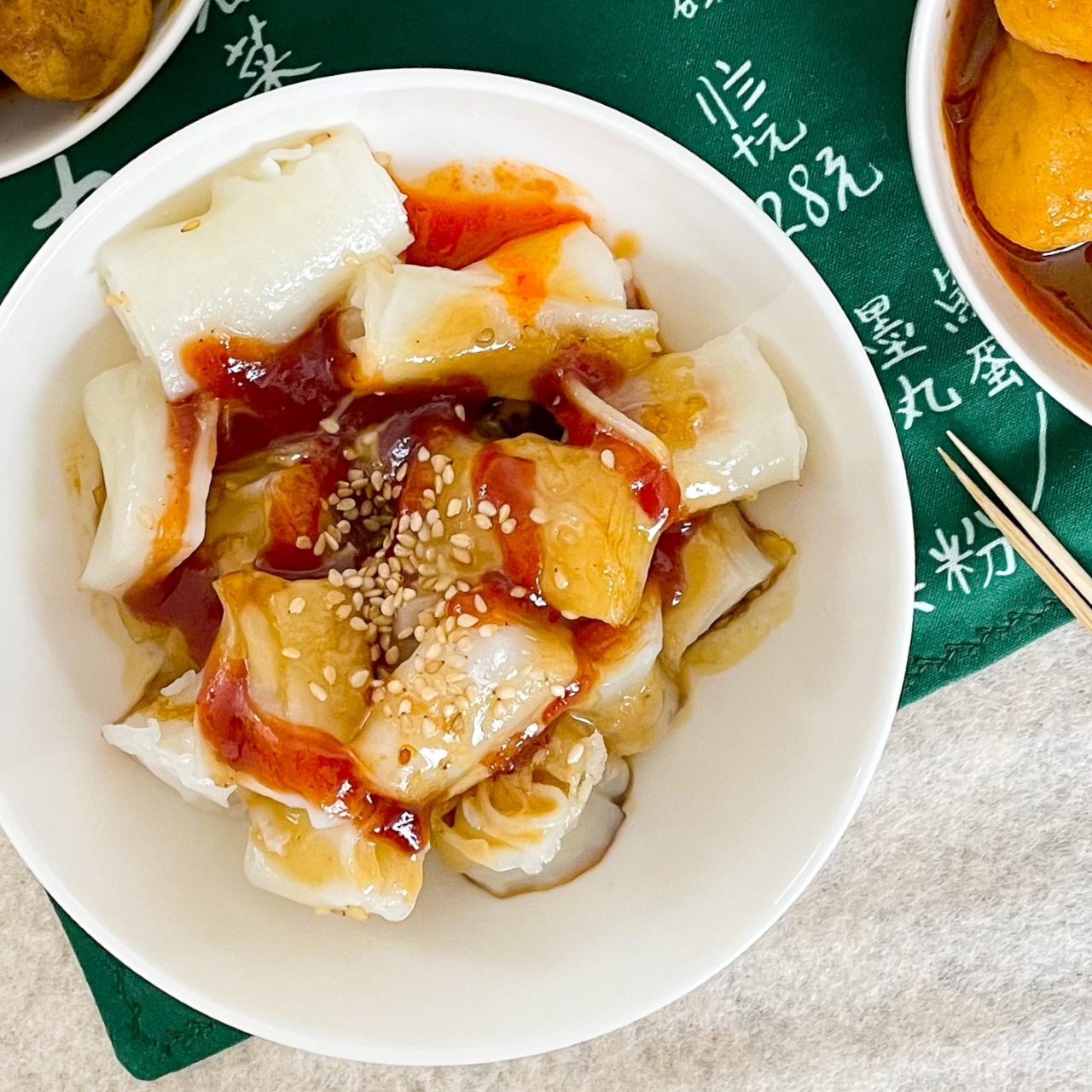 豬腸粉の猪とは豬仔=子豚。米粉を蒸し筒状に丸めた形が豚のしっぽに似ていることから、この名前がついたようです。香港や広州の朝食メニューや飲茶の点心としてよく食べられてる物です。