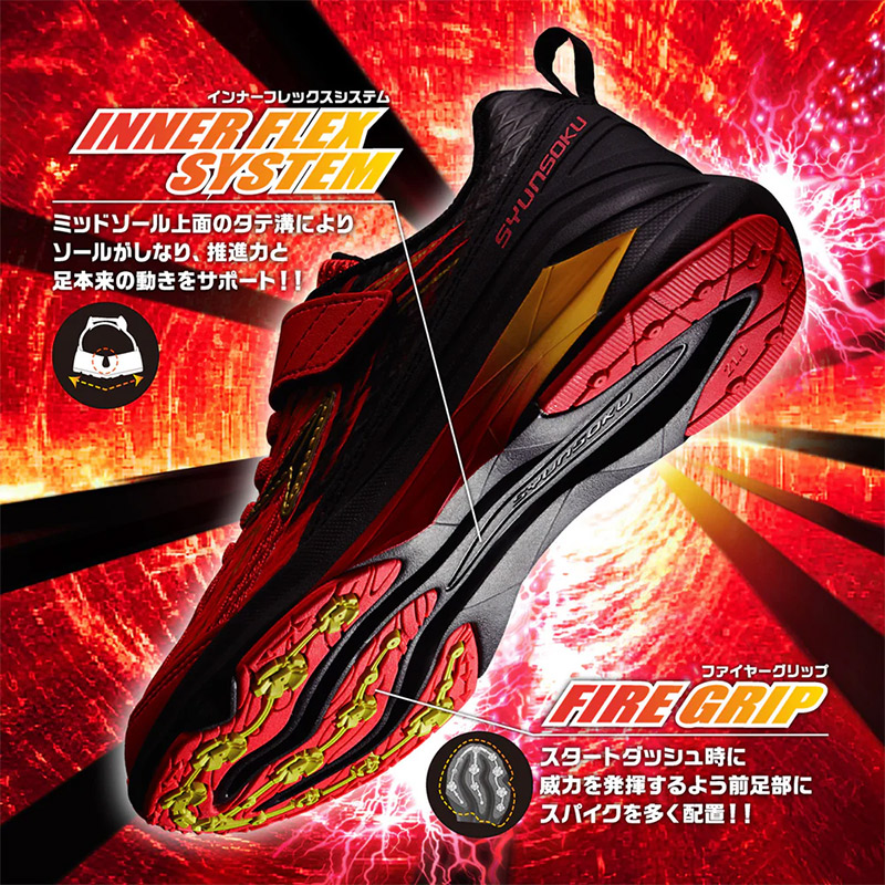 スタートダッシュ時に威力を発揮する「前足部のスパイク(ファイヤーグリップ)」と、瞬足のDNAともいえる「左右非対称ソール」を搭載し、コーナリングにも強いスピード特化の一足です。