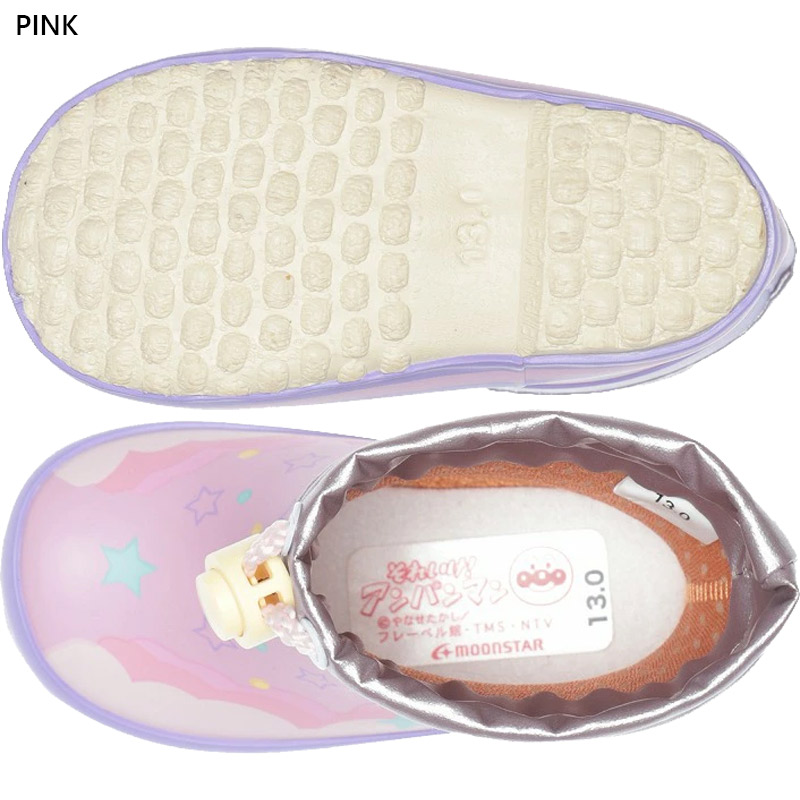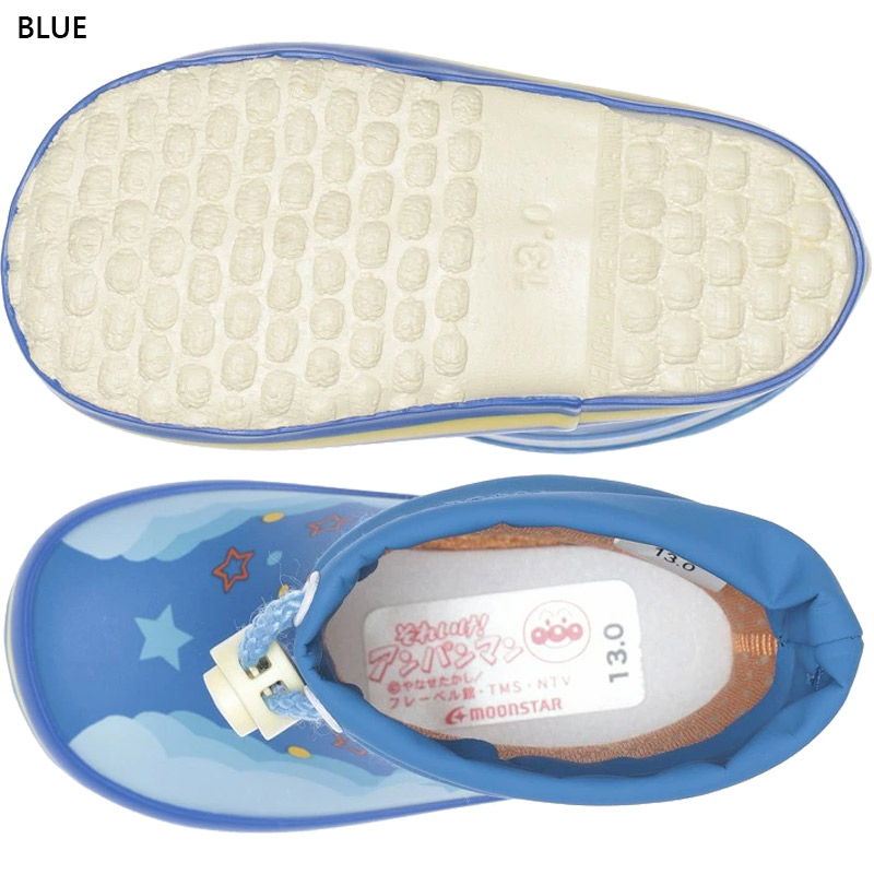 大人気「アンパンマン」のベビー用ラバーブーツです。星空を飛ぶアンパンマンがポイントのデザインです。履口に付いているコードストッパーで紐の絞りを調整することにより、雨雪が靴内に浸入しにくくなります。通園やおでかけにも活躍する一足です。重さは13.0cmで片足約150gです。