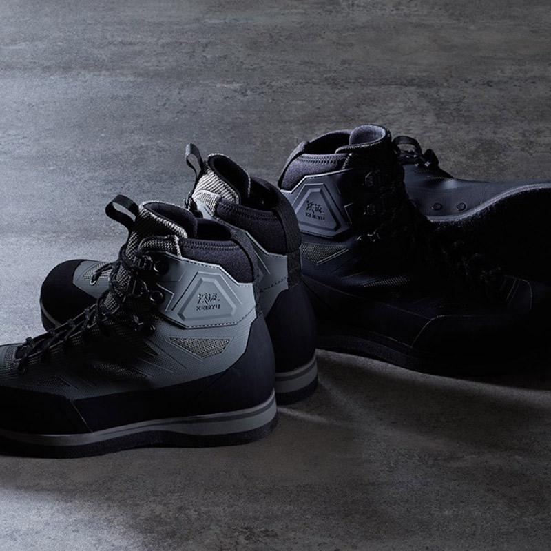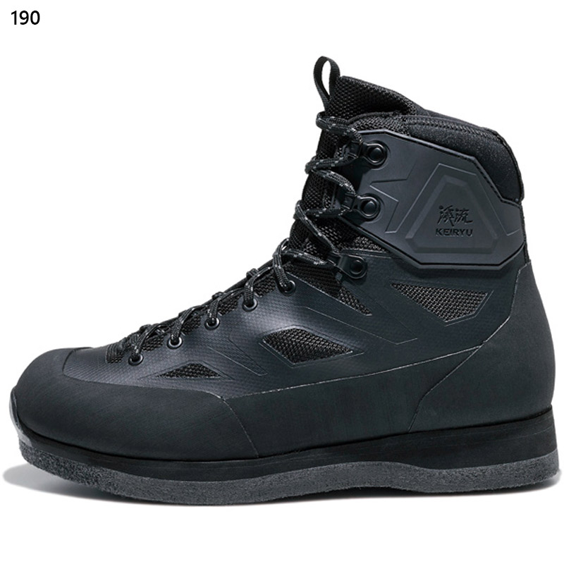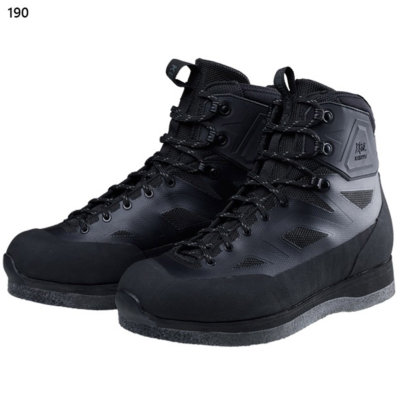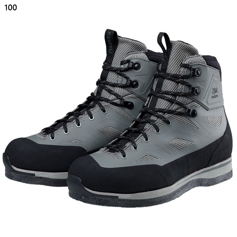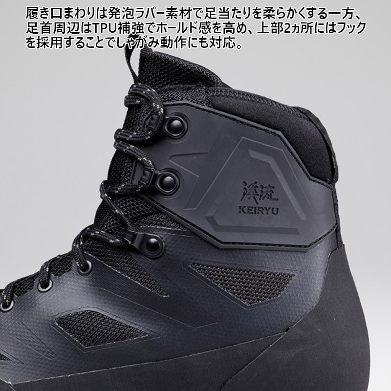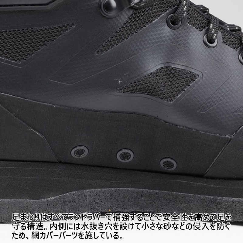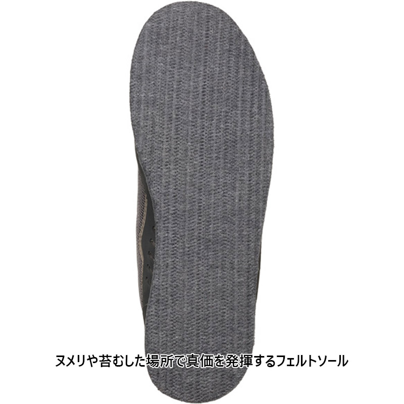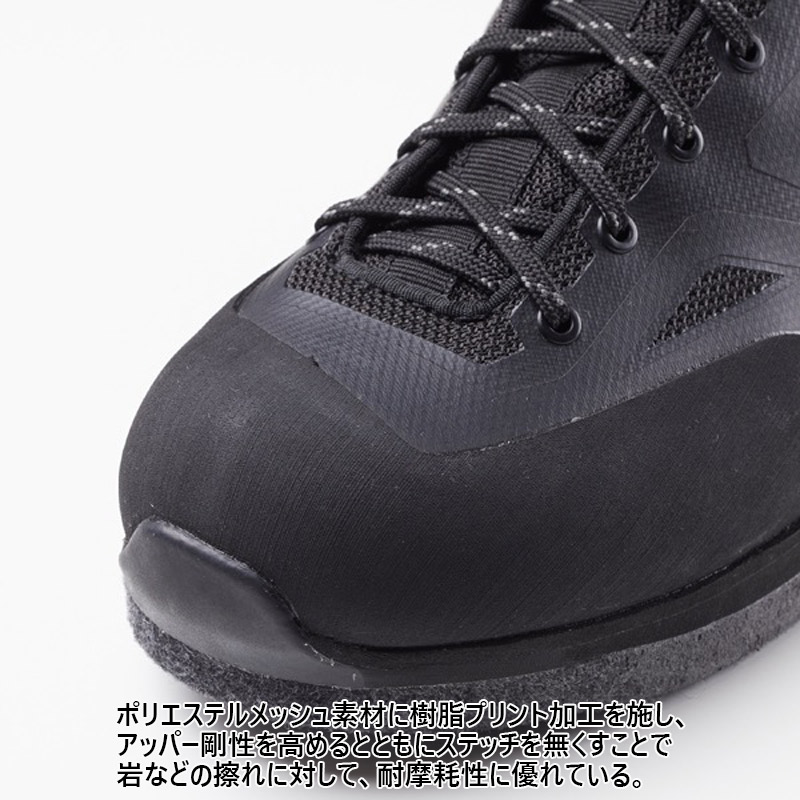 渓流の中・上流域でのさまざまな状況にも対応するモデルです。岩などの擦れによるステッチ切れを防止するため、ポリエステルメッシュアッパーに剛性を高める樹脂プリント加工を施した、シームレスアッパー構造を採用。履き口にはストレッチ性のある発泡ラバー素材を組み合わせることで、足首部のフィット感向上と砂などの異物侵入を防ぎます。さらには履き口上部2か所にはフックを採用したことで、足首の柔軟な動きにも即座に対応が可能です。くるぶし部分にはTPU補強を施すことで、足首の安定感とホールド感を高めています。フェルトアウトソールは土踏まず位置に若干の高さ変化による高低差を作ることにより、石などの凹凸に対するフリクション性能を高めています。