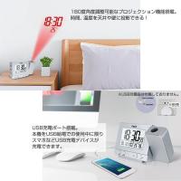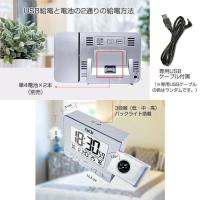 ● 投影機は180度角度調整が可能で、お好みの場所に時間と温度を投影表示できます。本機をUSB給電での使用中に限り、プロジェクションボタンのON/OFFにて、常時投影に切り替えることもできます。電池駆動の場合は、プロジェクションボタンのON/OFFにて、ライトボタンを押すと8秒間投影するかどうかを選択できます。