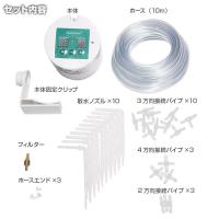 ◆ セット内容:本体、ホース(10m)、本体固定クリップ、フィルター、散水ノズル×10、3方向接続パイプ×10、4方向接続パイプ×3、2方向接続パイプ×3、ホースエンド×3、英文説明書×1