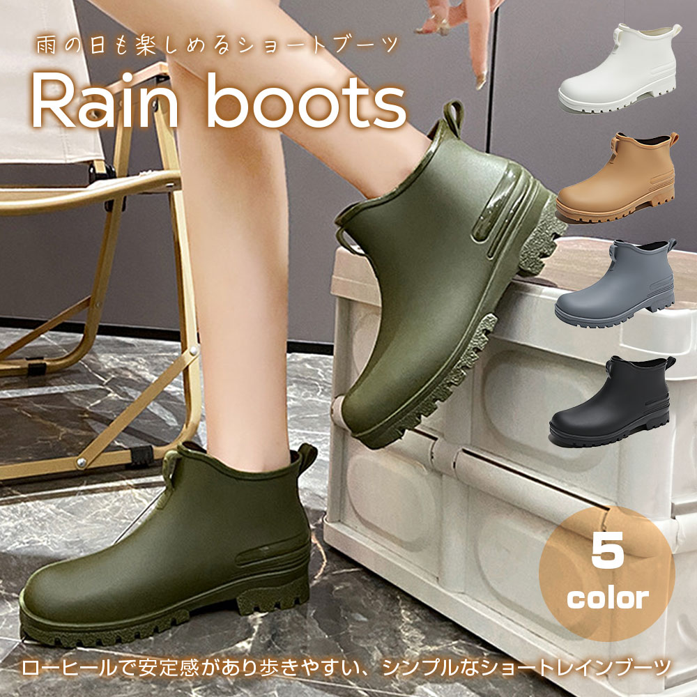 ローヒールで安定感があり歩きやすい、シンプルなショートレインブーツ。