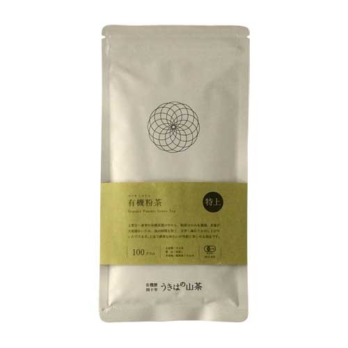 うきはの山茶は、深くうるおう自然が今なお残る耳納連山の山あいで、土づくりにこだわり、農薬や化学肥料のたぐいを一切使用せずに栽培された、安全な茶葉が原料。自社の製茶工場では、山からの涌き水を利用し、深蒸し製法で丁寧に仕上げます。渋みを抑えた濃厚な味わいが特徴です。 有機粉茶 特上は、上質な一番茶の有機茶葉の中から、粉部分のみを選別。茶葉が大変細かいため、抽出時間も短く、手早く淹れてお召し上がりいただけます。上品で濃厚な味わいが気軽に楽しめる一品です。*メール便でお送りできます。 ■原材料:有機緑茶 ■原材原産地:福岡県 ■内容量:100g ■主品種:やぶ北 ■製法:深蒸し ■製造販売者:新川製茶